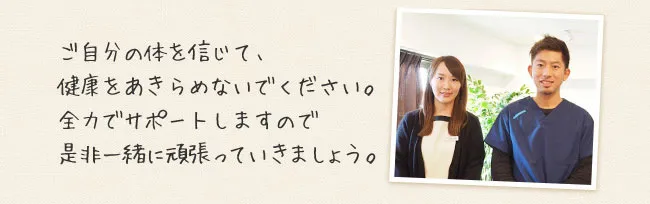 どんな症状もすぐに治るわけではないので、患者さんと一緒にもがき、苦しむときもあります。しかしながら、はじめは不安と苦痛の表情をして来院される患者さん が少しずつ元気を取り戻し、明るく元気な姿に戻っていく、この時本当にこの仕事をやっていて良かったと感動します。