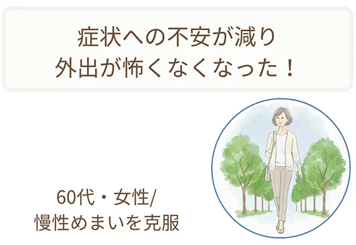 - 原因不明のめまいに不安を感じ、 毎日の「恐怖心」から解放されたい。