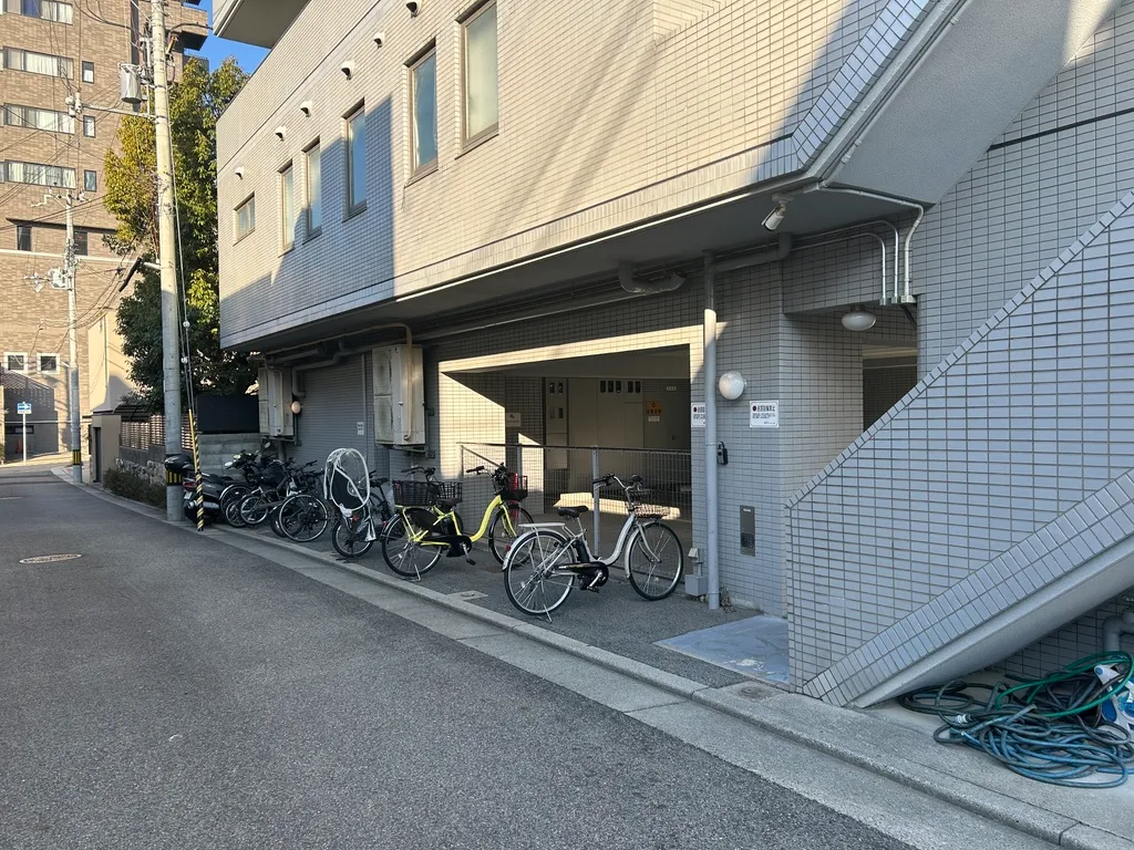 赤マルの所に駐輪所があります。(ビルの南)