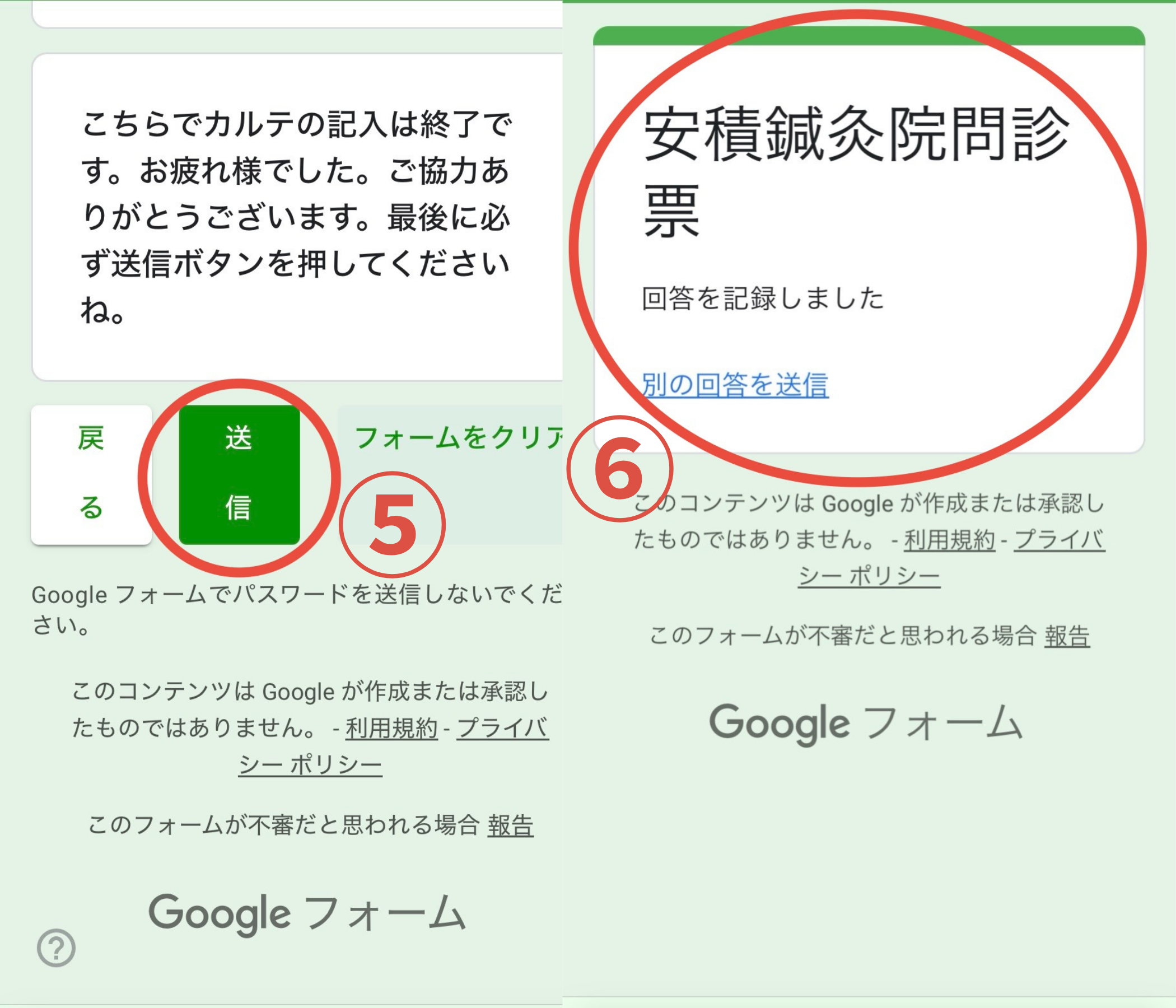 ⑤ 問診票ご入力が全て終わりましたら『送信』ボタンが出てきますので、必ず押してください。
