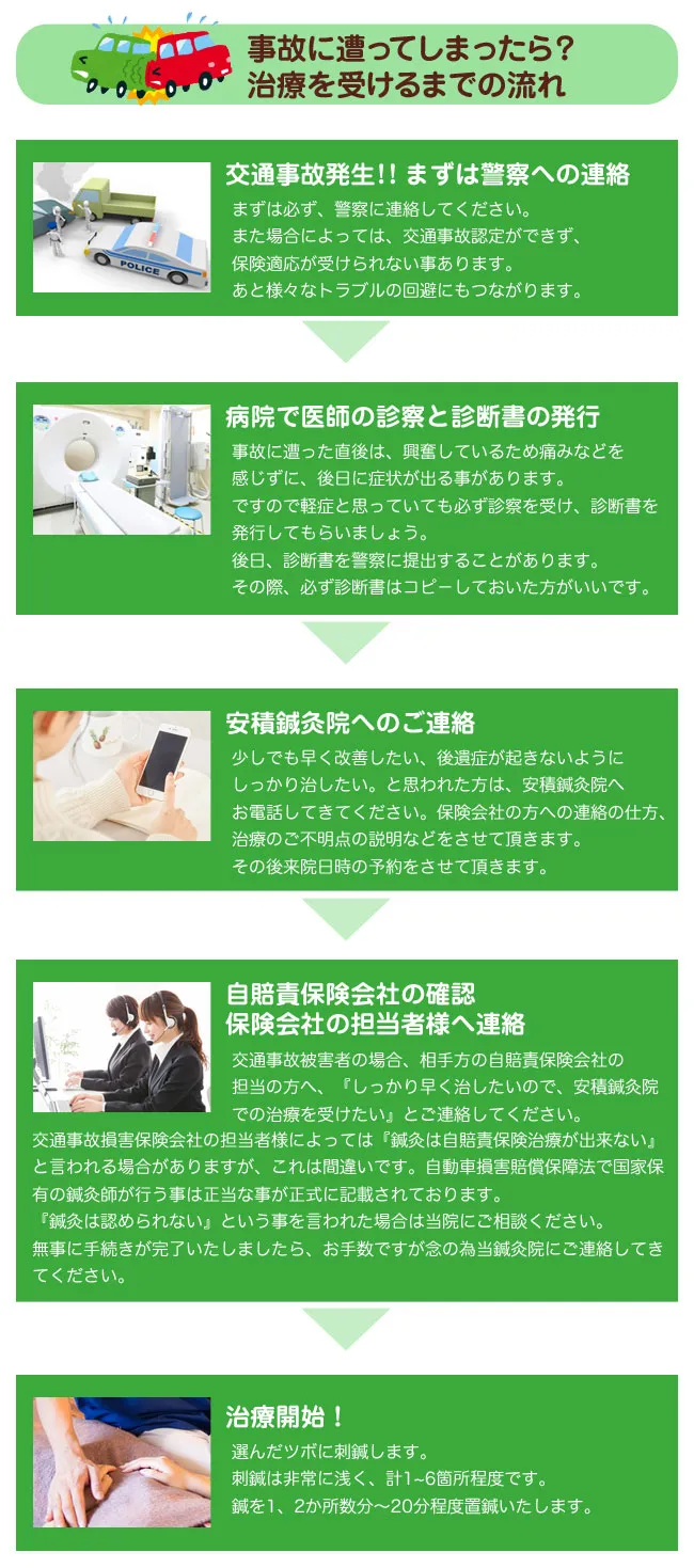 ※時々保険担当者によって、鍼灸は自賠責保険治療が出来ないという事を言われる事がありますが、それは間違いです。