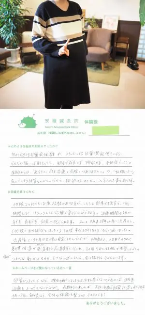 婦人科だけの治療に集中してしまうと、赤ちゃんが欲しいという気持ちに凝り固まって、神経的に疲れてしまいそうだったので、 少しでも授かりやすい身体になれたらと安積先生の治療院に通い始めました。