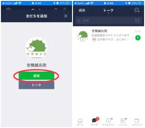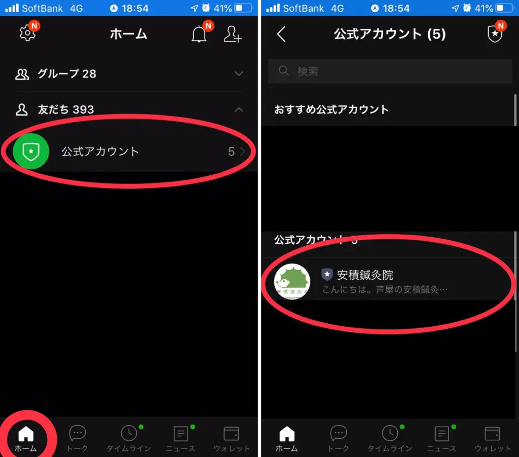左下のホームボタンを押して頂き、友だちリストの公式アカウントの中から安積鍼灸院を探してください。