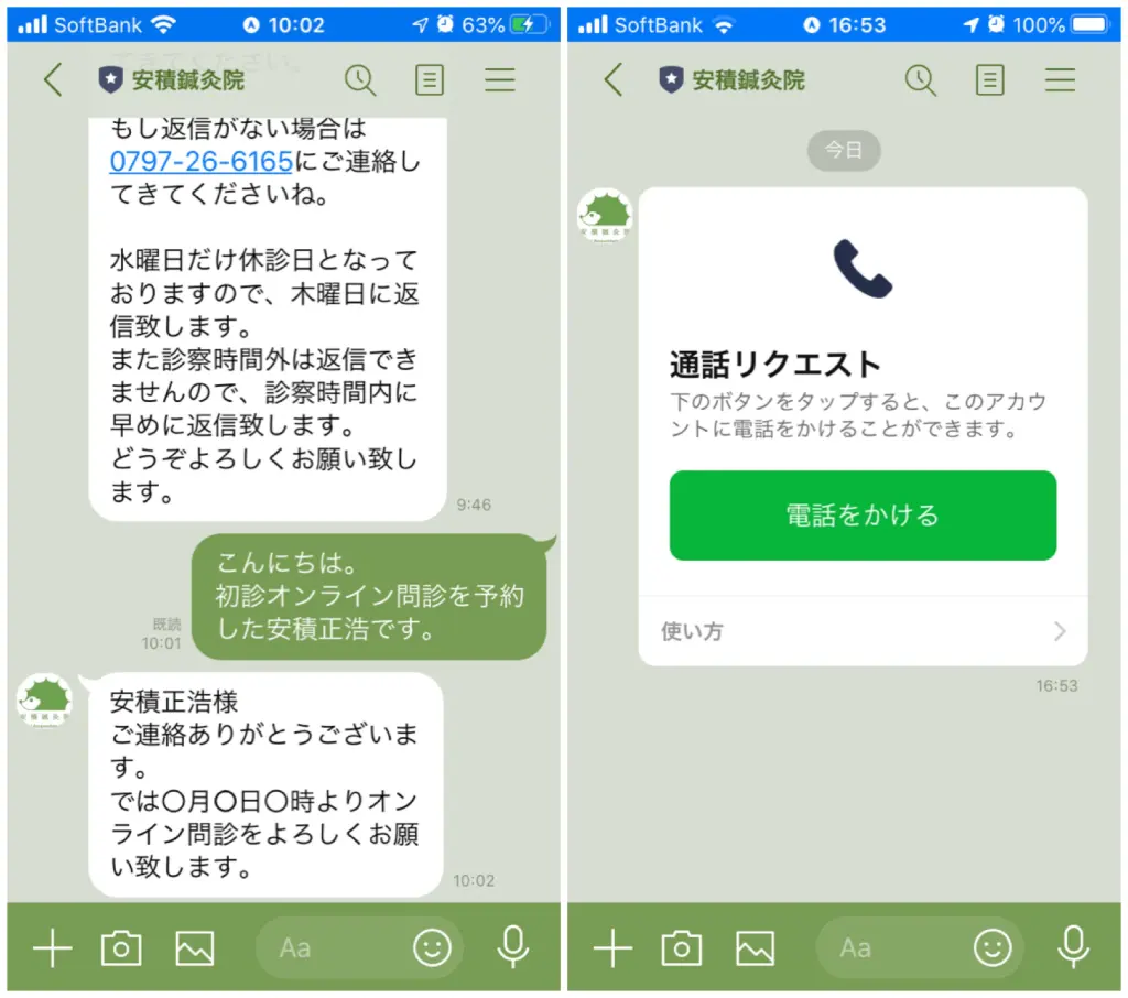 問診日時になれば、こちらから通話リクエストのメッセージを送ります。